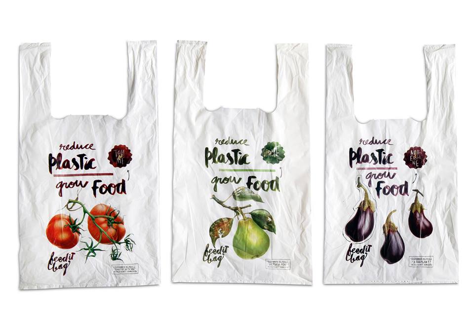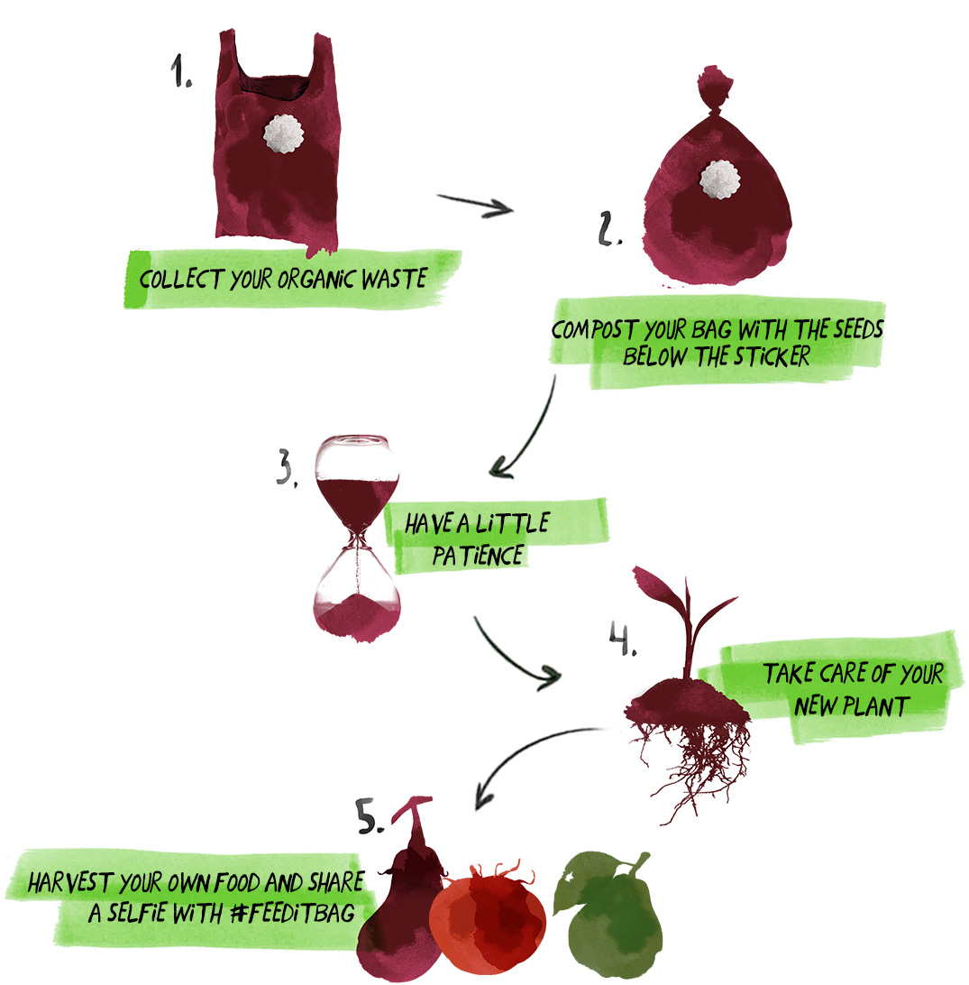 ถุงหูหิ้ว FEEDitBAG มีส่วนประกอบจากแป้งข้าวโพด บนตัวถุงมีเมล็ดพันธุ์ที่นำไปปลูกต่อได้ ถุงย่อยสลายหมดเกลี้ยงภายใน 10 สัปดาห์