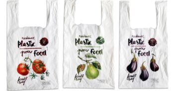 ถุงหูหิ้ว FEEDitBAG มีส่วนประกอบจากแป้งข้าวโพด บนตัวถุงมีเมล็ดพันธุ์ที่นำไปปลูกต่อได้ ถุงย่อยสลายหมดเกลี้ยงภายใน 10 สัปดาห์